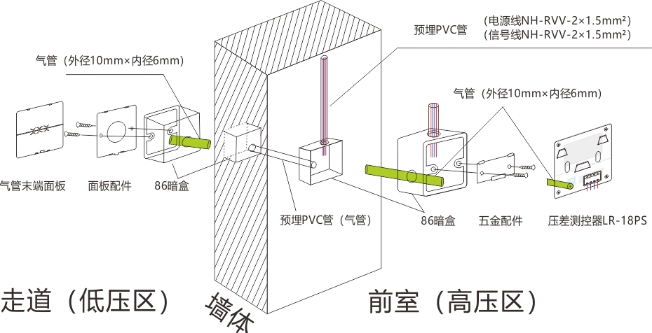 暗装:若项目有预埋PVC管及86型暗盒,压差测控器主体建议安装于前室/合用前室(高压区),通过内置式测压孔测压。走道(低压区)通过气管与压差测控器接气口连接(上图为背部接口式,明装可选顶部接口式压差测控器),为保证美观,气管末端出口可选装气管末端面板。
